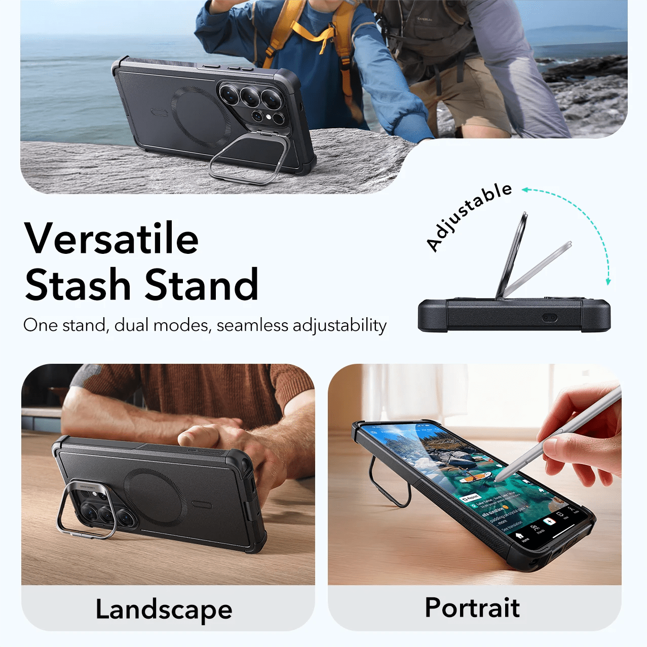 Versatile Stash Stand: a premium zinc-alloy Stash Stand with a dual-mode design offers stable, adjustable viewing angles for work or entertainment, without interfering with magnetic charging or accessory attachment