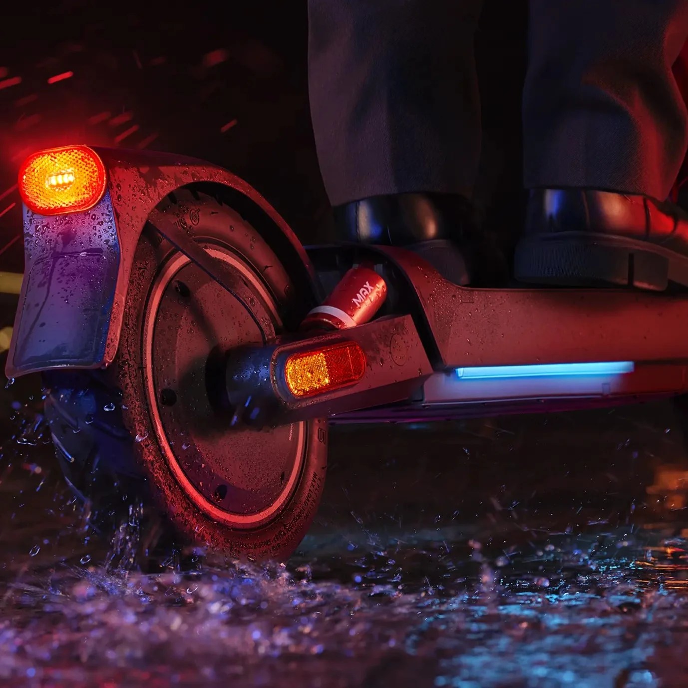 Equipped with a high-capacity 477 Wh battery, the Xiaomi Electric Scooter 5 Max offers an impressive range of up to 60 km on a single charge, reducing the need for frequent recharging. Safety is enhanced through a dual-braking system combining a front drum brake and rear E-ABS for consistent stopping power. Integrated automatic headlights, rear lights, ambient lighting, and turn indicators improve visibility and rider awareness, while the IPX5 water-resistant design ensures dependable performance in light rain and wet conditions.