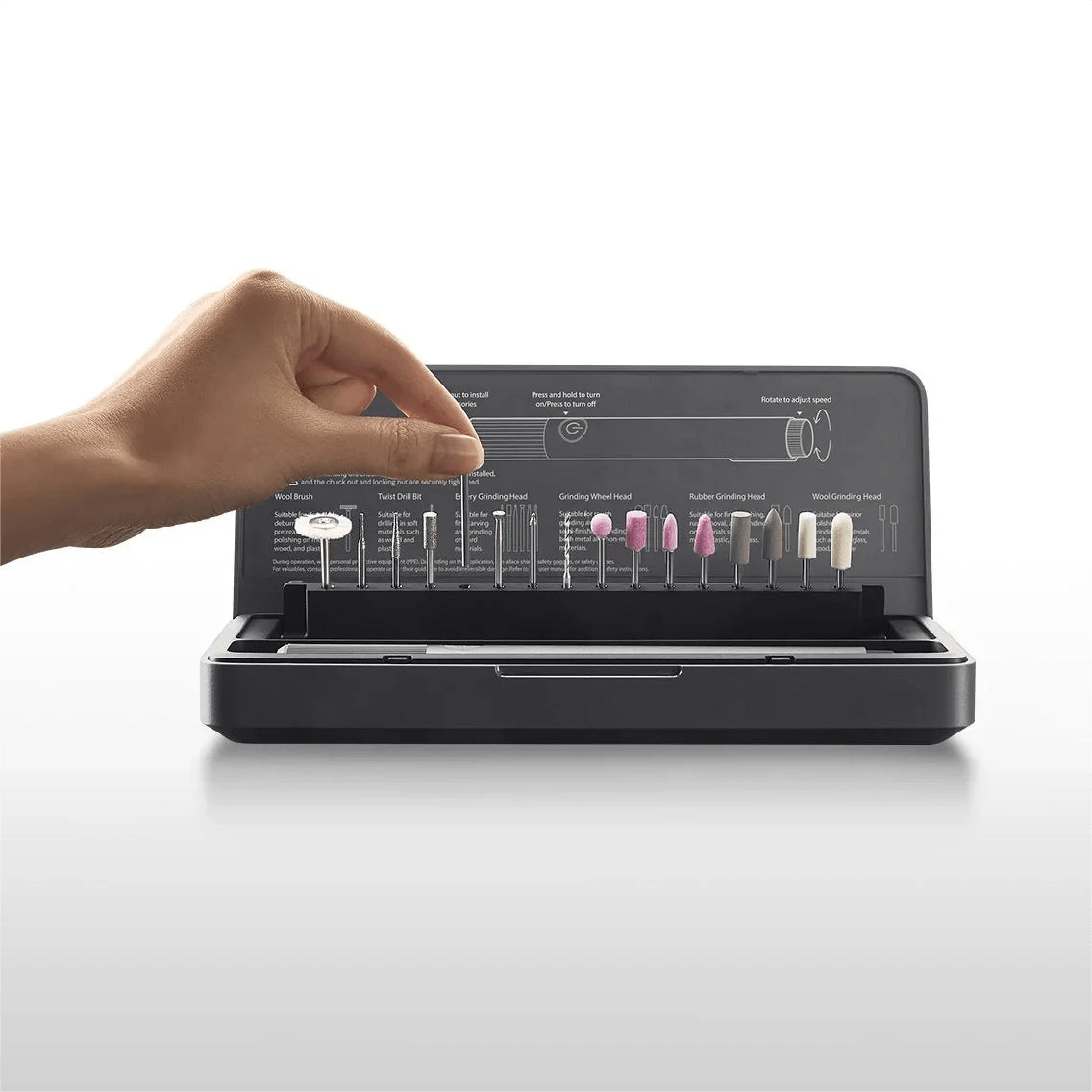 The kit includes 16 high-quality accessories with a 2.35 mm shank, all neatly organized in a smart storage case. Accessories include wool polishing wheels, twist drill bits, diamond grinding bits, abrasive grinding heads, and rubber grinding heads, covering a variety of applications such as polishing, drilling, shaping, carving, and fine finishing. This makes it suitable for both professional work and creative hobbies.