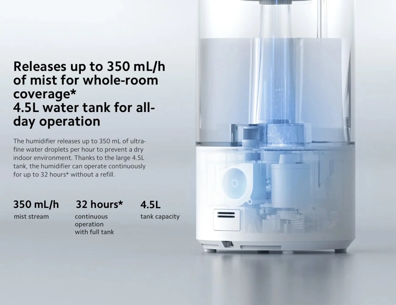 The humidifier releases up to 350 mL of ultra-fine water droplets per hour to prevent a dry indoor environment. Thanks to the large 4.5L tank, the humidifier can operate continuously for up to 32 hours* without a refill.